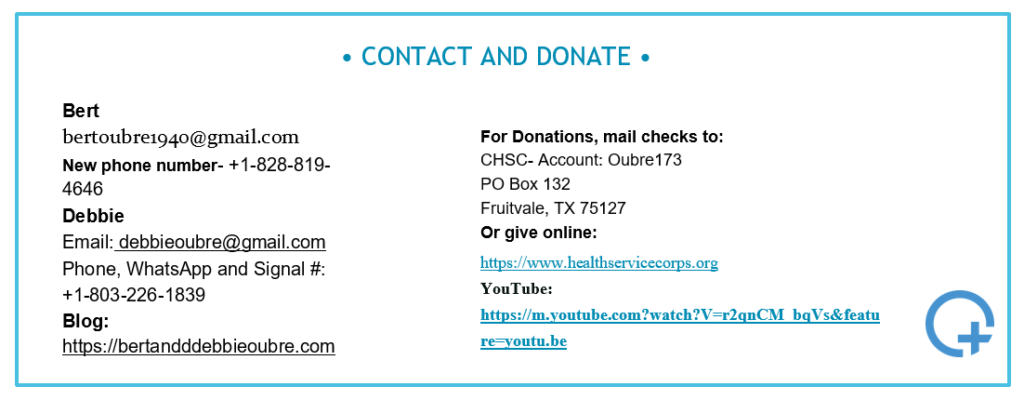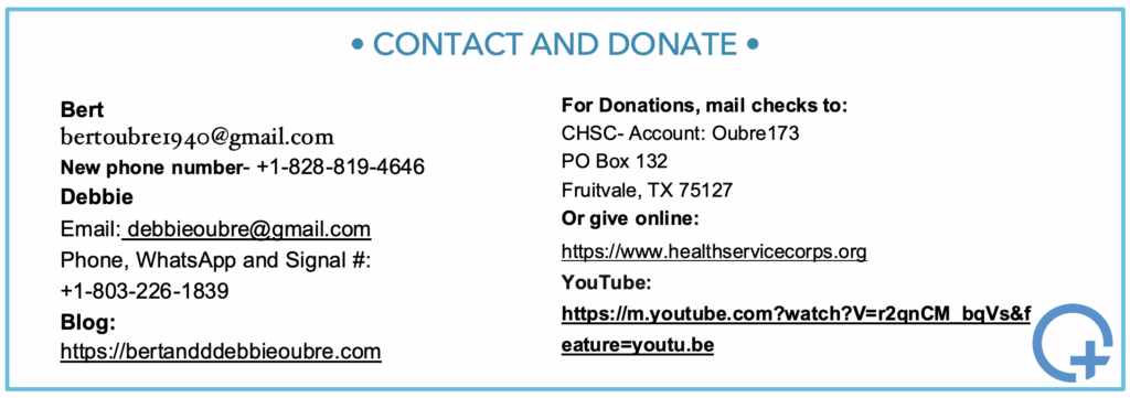 Debbie’s trip to Chad went smoothly. It’s always great to reconnect with the staff and community. Bert enjoyed his time in Texas. He was quite spoiled by Greg, Lily, Hannah, Dane and little James.
