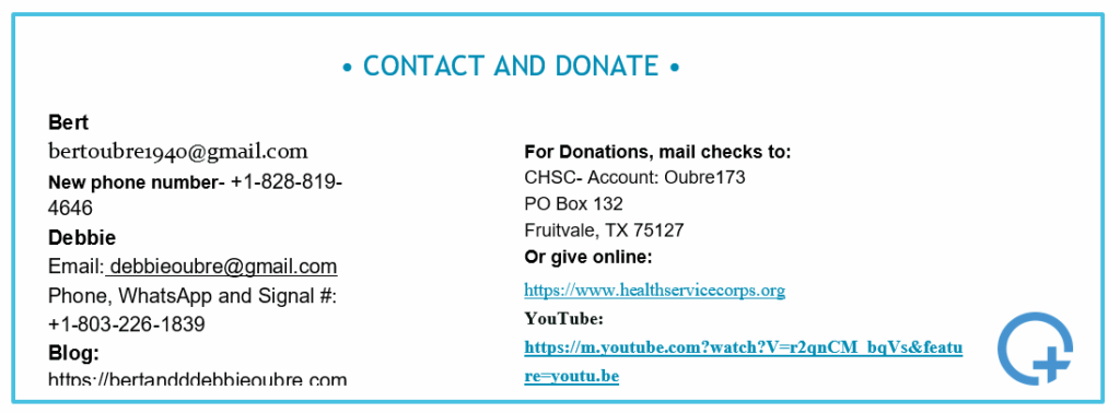 Debbie will be returning to Chad for two weeks July 29th– August 13th. Pray for safety, good health and that she might be an encouragement to the teammates on the field. Bert will be staying with his son, Greg, and Lily in Texas during that time.